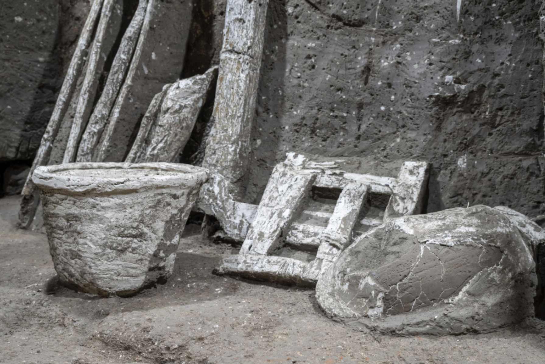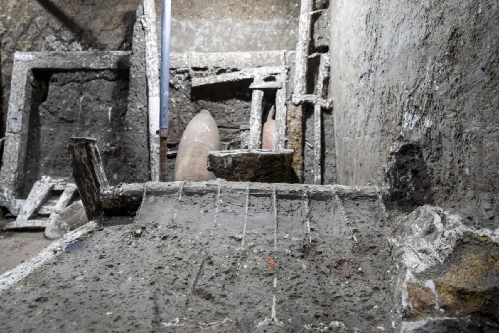 È l’ultima scoperta nel quartiere servile della villa di Civita Giuliana, indagata scientificamente sin dal 2017 quando fu strappata agli scavatori clandestini grazie a un accordo tra il Parco Archeologico di Pompei e la Procura della Repubblica di Torre Annunziata: un ambiente, conservato in maniera eccezionale come gli altri due scoperti nello stesso settore con i letti degli schiavi, dove è stato possibile realizzare i calchi di mobili e altri oggetti di materiali deperibili: legno, tessuti, corde. La tecnica dei calchi, sperimentata in maniera sistematica sin dal 1863 con la realizzazione dei primi calchi delle vittime dell’eruzione del Vesuvio nel 79 d.C., è unica al mondo in quanto frutto della dinamica specifica dell’evento catastrofico: persone o oggetti travolti e coperti dalla “corrente piroclastica”, una nube ardente di cenere e gas tossici, sono rimasti lì per secoli. Ma mentre la cenere si è solidificata, formando uno strato molto solido noto come “cinerite”, il materiale organico quali corpi umani, animali o oggetti lignei, si sono decomposti, lasciando un vuoto nel terreno. Questi vuoti possono essere riempiti di gesso durante lo scavo, per riottenere, dall’impronta in “negativo”, la forma originale. Una tecnica che ha portato a risultati straordinari nella villa di Civita Giuliana, dai calchi di due vittime e di un cavallo a quelli dei letti modesti del quartiere servile.