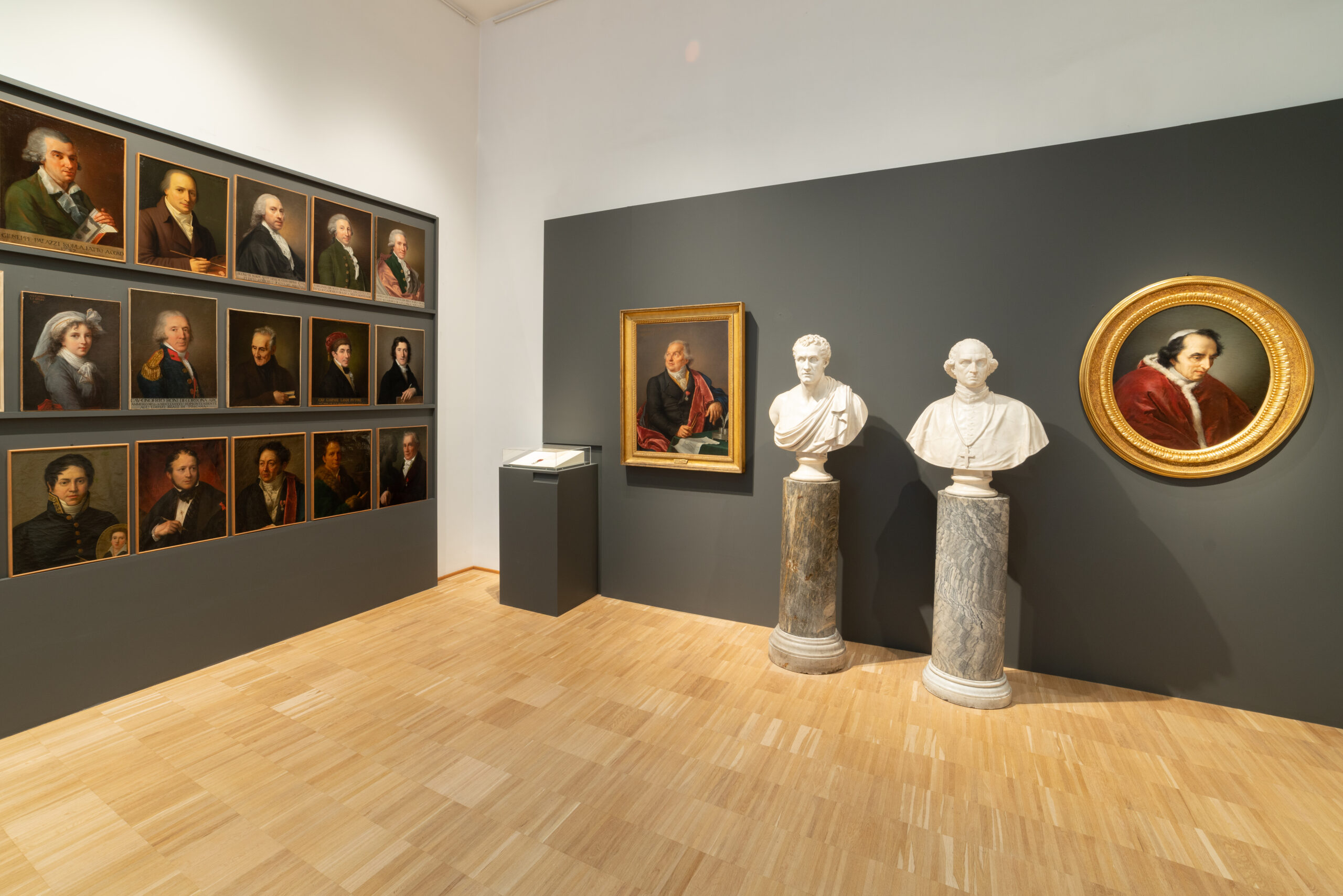 Fra i diversi nuclei di ritratti qui proposti, sono presentati i busti marmorei di Canova e del cardinal Pacca, cui si è voluto affiancare le effigi di Pio VII e di Giuseppe Valadier, quest’ultimo architetto protagonista, insieme a Giuseppe Camporese e Raffaele Stern, dei grandi cantieri romani del tempo.