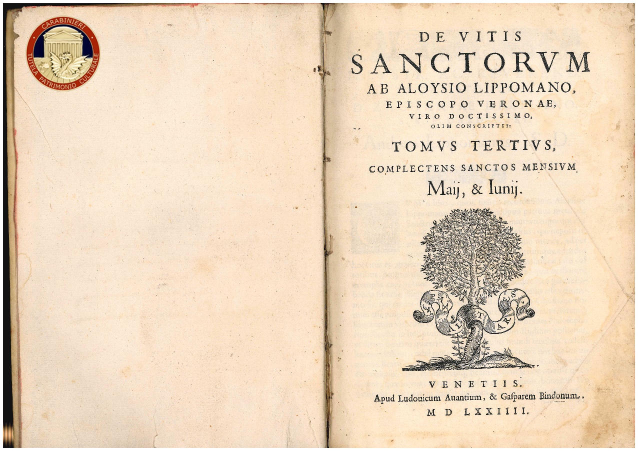 I Carabinieri del Nucleo TPC di Napoli restituiscono alla comunità di Giove una cinquecentina pubblicata a Venezia, terzo tomo terzo tomo del De vitis sanctorum (1574)