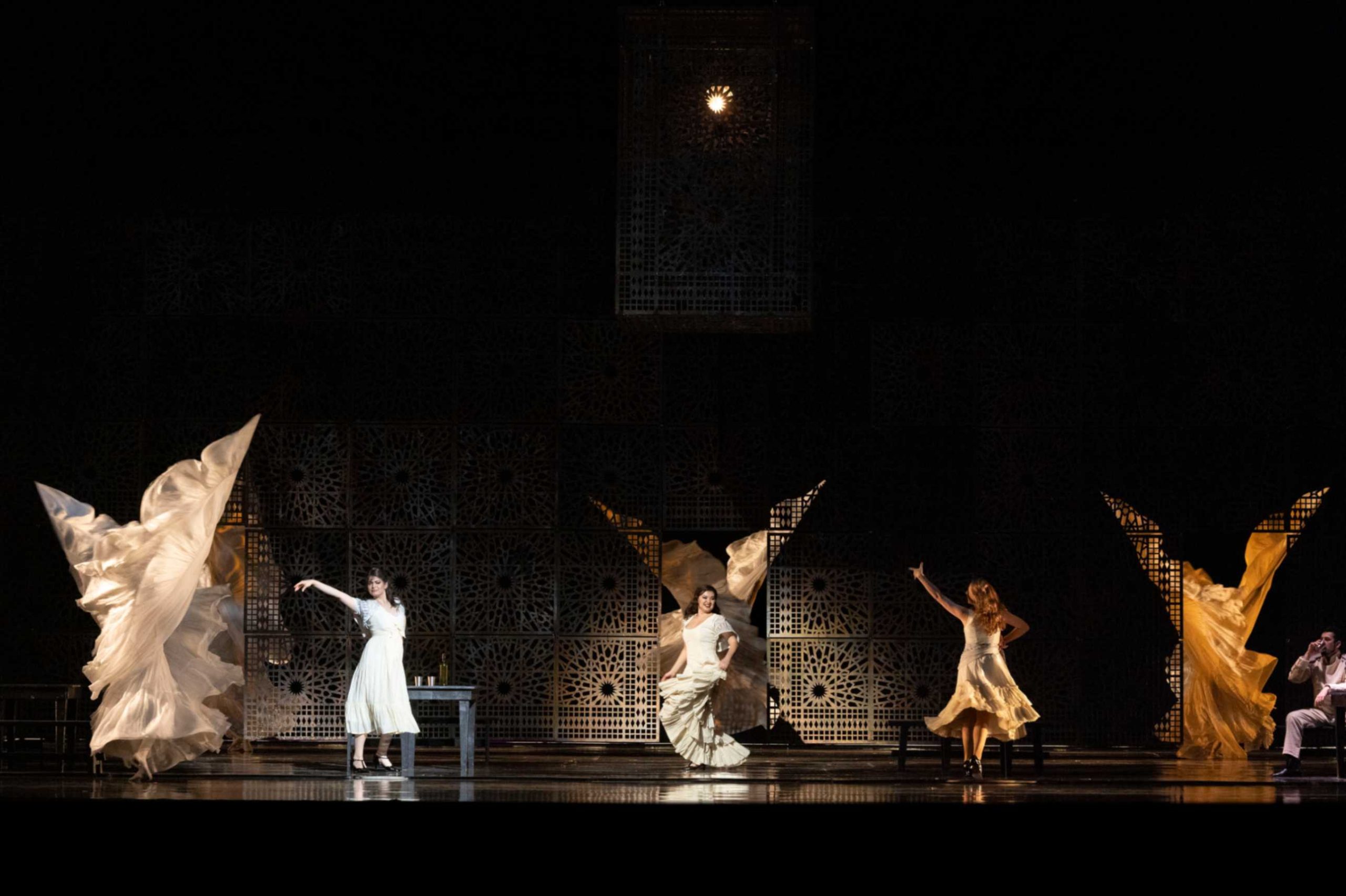 “Questa regia è stata pensata in forma pittorica – racconta Finzi Pasca. Tonalità di luce scompongono lo spazio come fossero colpi di pennello usando quattro colori dominanti: il giallo del primo atto, il bianco del secondo e poi a seguire il nero e il rosso. Le scene di Hugo assistito da Matteo, i costumi di Giovanna e le coreografie di Maria hanno dialogato con questa dimensione cromatica reinventando una Spagna sospesa in un non-tempo, onirica, concreta e irreale fatta della stessa materia che compone i miei sogni.”