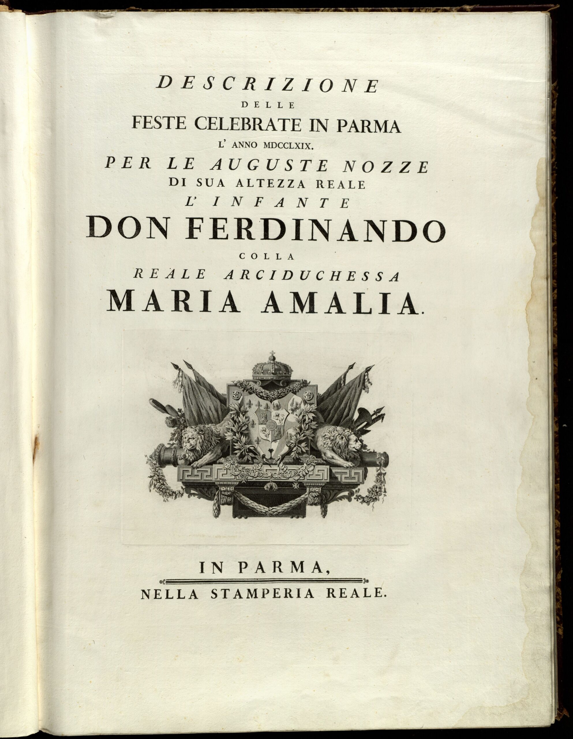 Inizia subito la collaborazione con l’architetto Petitot e l’incisore Benigno Bossi per la stampa di edizioni celebrative dei fasti del Ducato quali l’Ara Amicitiae in memoria della visita dell’imperatore Giuseppe II e la Descrizione delle Feste celebrate in Parma l’anno MDCCLXIX. Per le auguste nozze di sua altezza reale l’infante Don Ferdinando colla reale arciduchessa Maria Amalia, il più splendido libro italiano di feste adorno di 70 fra tavole fuori testo, capilettera, testate e finalini; entrambe le opere sono del 1769.
