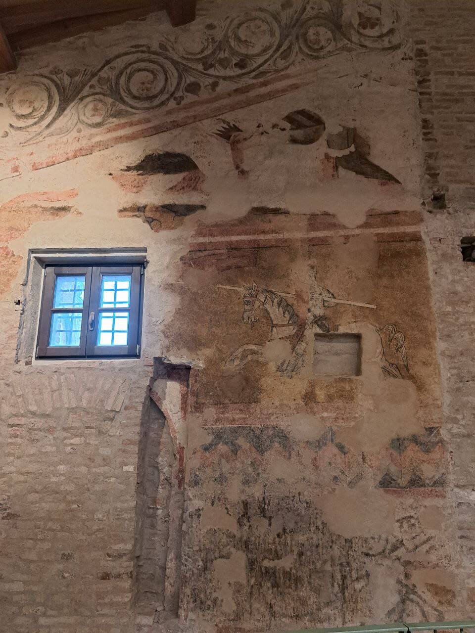 Questo Museo Virgilio permette anche la fruizione dello stesso Palazzo del Podestà: straordinari innanzitutto i lacerti di affreschi ritrovati dopo il terremoto del 2012, nella sala dove si è posto il trono di Virgilio del II secolo a. C., in marmo di Chio. Data la recente scoperta, questi affreschi li stanno ancora studiando. Rappresentano da una parte i mesi con vivide storie stagionali, mentre dall’altra abbiamo scene di guerra. Da non perdere anche lo stemma del Podestà di origine fiorentina Gabriele Ginori (1493-97).