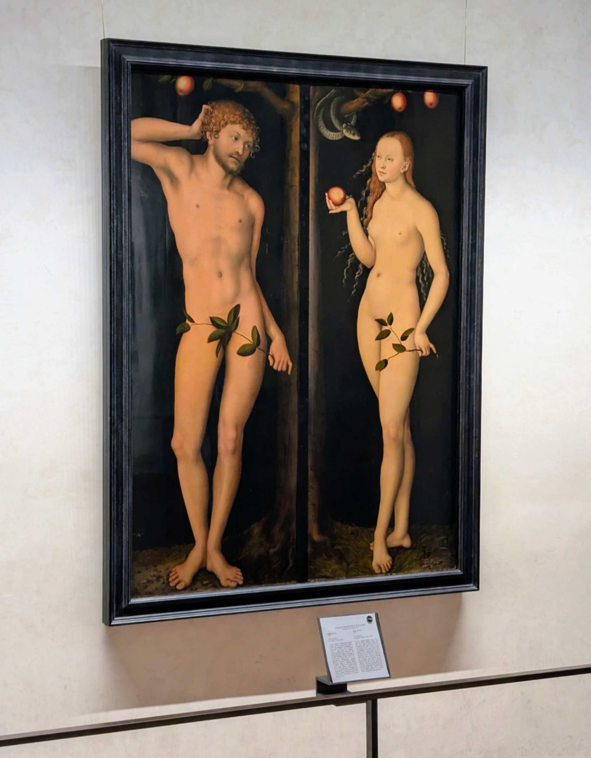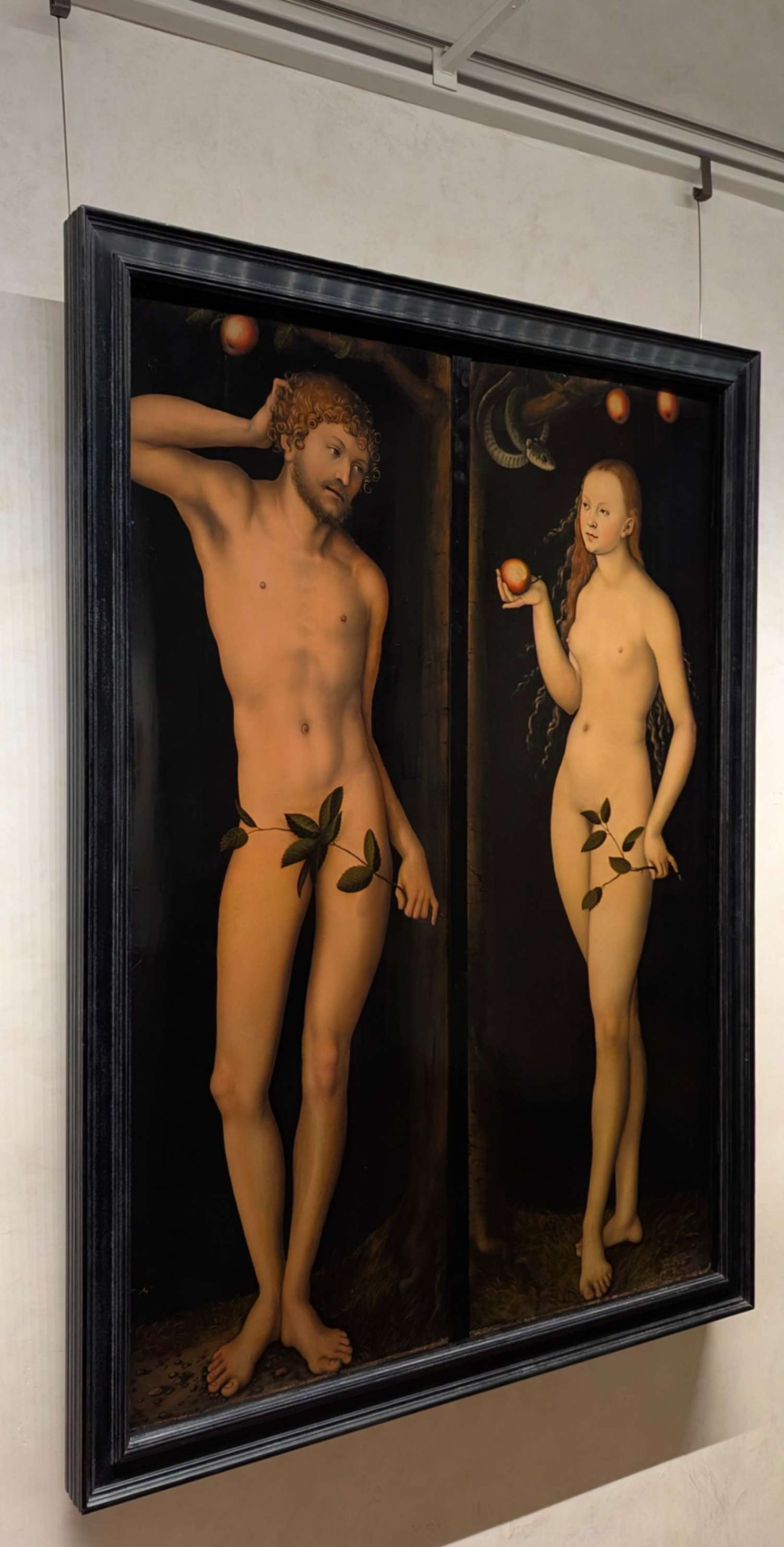 Riunita in una unica cornice (che ricompone anche le due parti dell’Albero della Conoscenza) la leggendaria coppia di tavole “Adamo ed Eva”, realizzate dal grande pittore tedesco Lukas Cranach (Kronach, 1472 – Weimar, 16 ottobre 1553), protagonisti indiscussi delle nuove sale dei pittori fiamminghi al secondo piano della Galleria degli Uffizi. Del tema di Adamo ed Eva, i progenitori che caddero in tentazione condannando l’umanità, Lukas Cranach dipinse, con i suoi collaboratori, oltre cinquanta versioni.